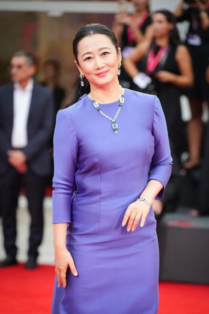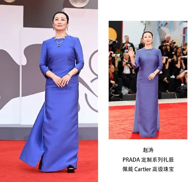 中国影后赵涛则身穿PRADA定制系列礼服、佩戴Cartier高级珠宝亮相,简约的廓形却不失光彩,珠宝点睛,一切都恰到好处,优雅从容又透着文艺气息。