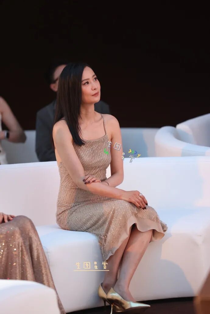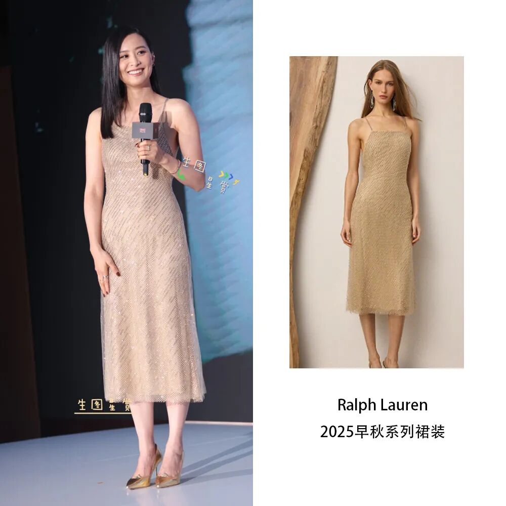 陈法拉身着Ralph Lauren2025先秋系列金色吊带连身中长裙出席活动,很简约的吊带裙,款式基础材质就不基础,双层裙摆配着闪亮面料,彰显低调的贵气。