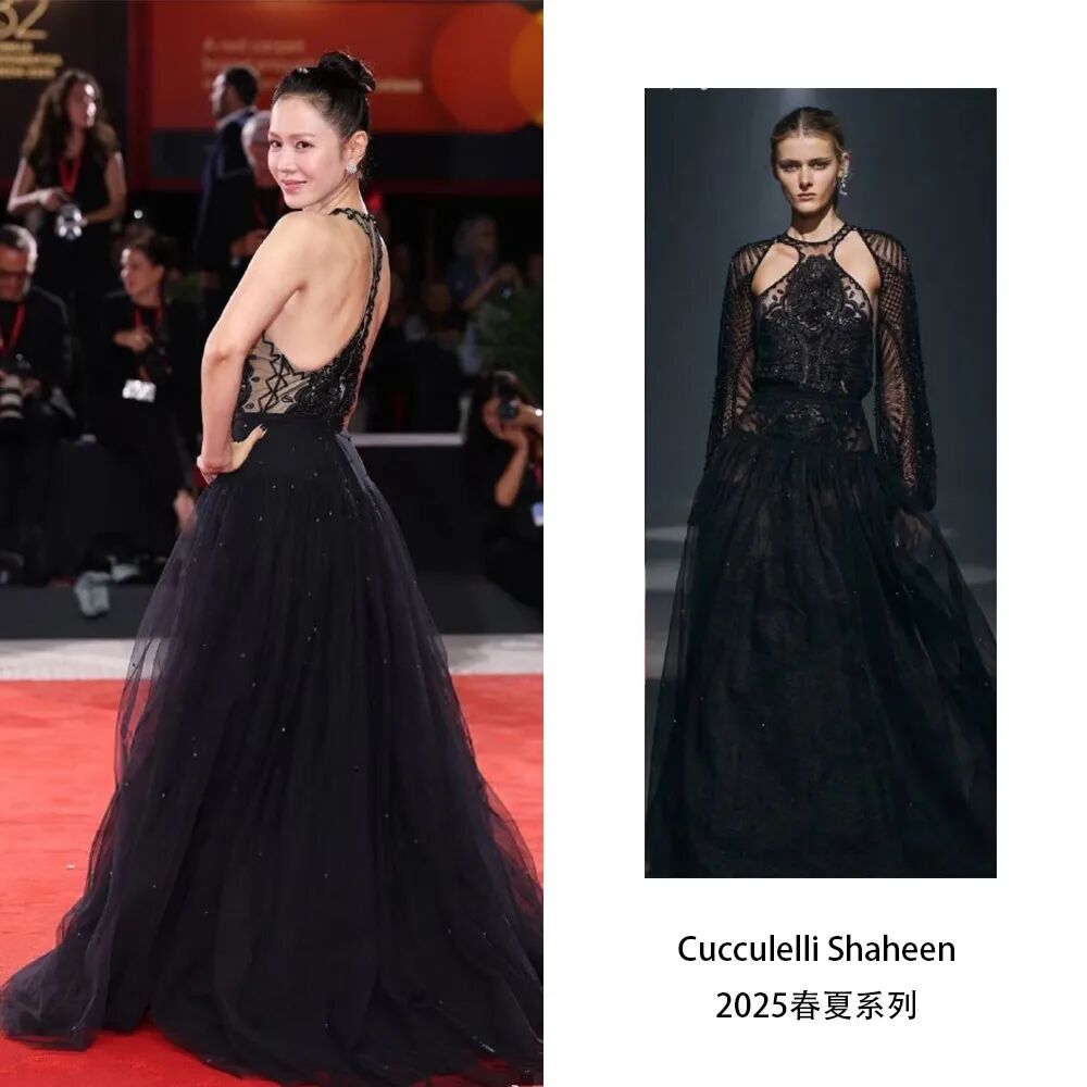 孙艺珍亮相威尼斯电影节,她穿的是来自纽约时装品牌Cucculelli Shaheen,黑色蕾丝礼服,裙身以繁复精美的蕾丝与神秘透视细节交织,犹如暗夜中绽放的奢华艺术。