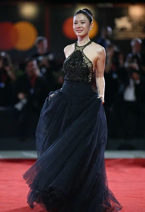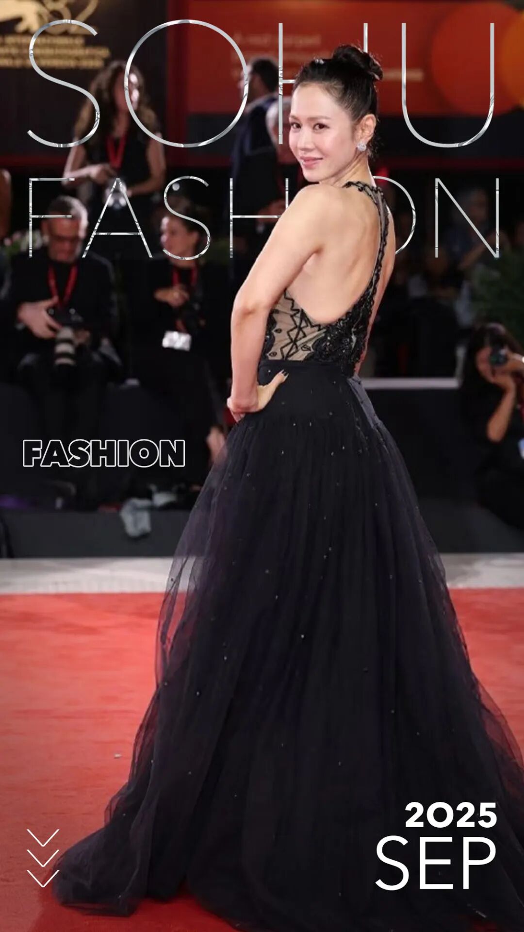 一袭墨色长裙在红毯上迤逦而行,与浓郁热烈的红色背景形成极致对比,恍若一幅流动的油画。她将发丝利落挽起,露出优雅肩颈线条,整体造型既显高贵雍容,又透出灵动的戏剧张力,宛若黑天鹅临境。