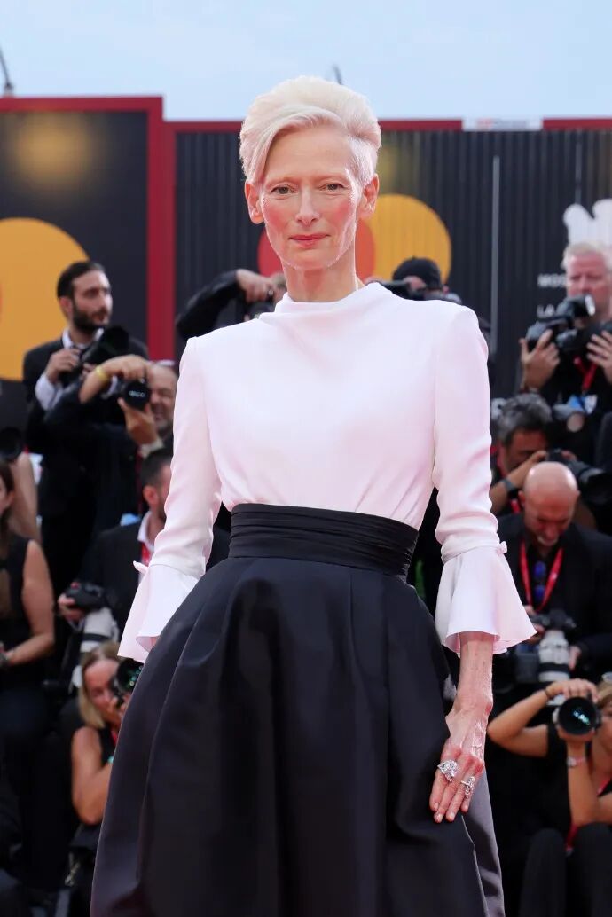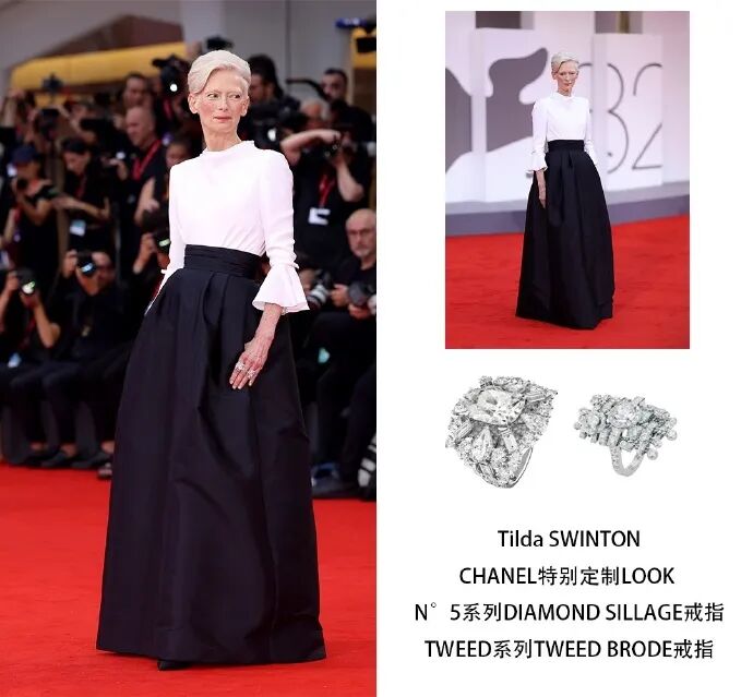 Tilda SWINTON身穿香奈儿特别定制的白色真丝绉绸上衣与黑色真丝米卡多半裙;佩戴香奈儿DIAMOND SILLAGE戒指,及TWEED BRODÉ戒指;出席红毯,微阔的袖口增添甜美元素又不夸张,挺括黑色裙装质感上乘,黑与白的纯粹碰撞出极致的优雅。