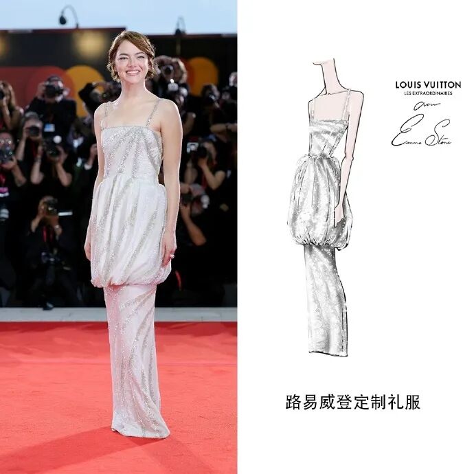 Emma Stone身着路易威登定制礼服并佩戴高级珠宝系列出席第82届威尼斯国际电影节《拯救地球》(Bugonia)首映礼。