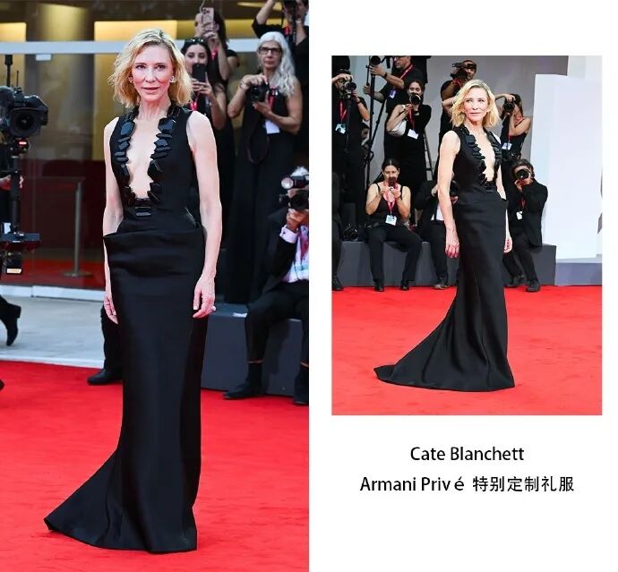 大魔王Cate Blanchett上身的是Armani Privé 特别定制礼服,胸前的宝石装饰更有力量感,深V设计增添露肤度,气场与性感并存~