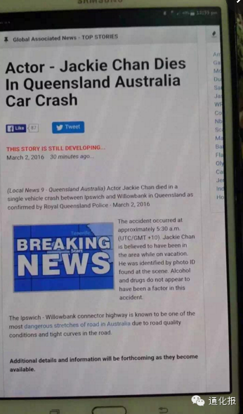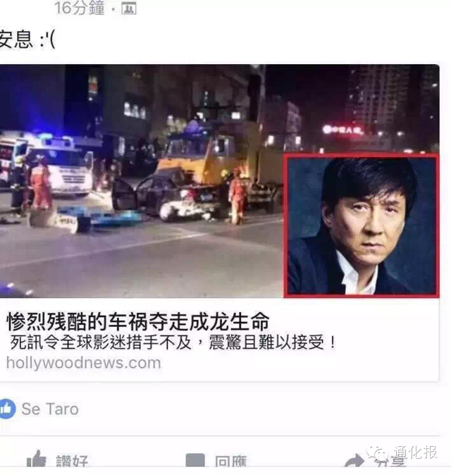 其实,成龙大哥被死亡已经不是一次两次的事情了。早在2013年,网络上就谣传其坠楼身亡的新闻,成龙显得很无奈,开玩笑让担心自己生死的朋友不要着急:“放心,我死一定把你们带走。”