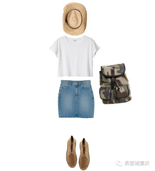 【搭配小Tips】:简洁小草帽+白T恤+浅色牛仔短裤+迷彩休闲包