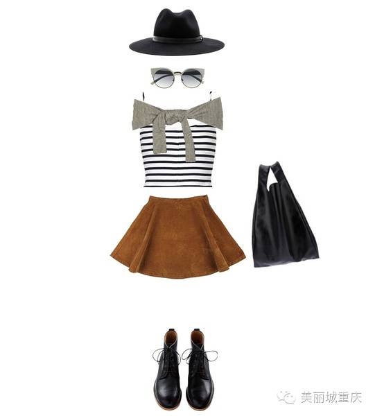 【搭配小Tips】:黑色宽檐帽+条纹短上衣+棕色短裙+黑色休闲包
