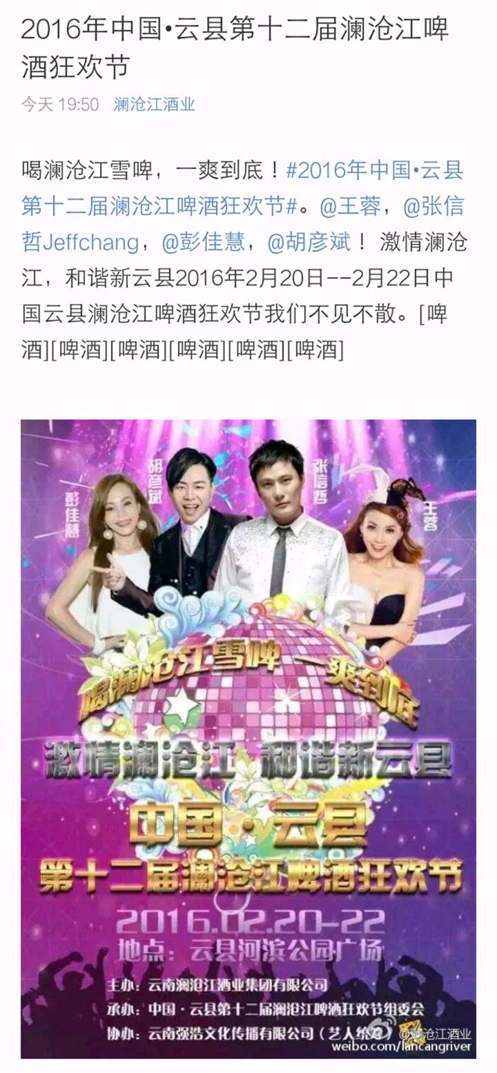 新浪微博@澜沧江酒业2016年1月29日发布微博:王蓉、张信哲、彭佳慧、胡彦斌将参加中国云县第十二届啤酒狂欢节文艺晚会演出。云县啤酒狂欢节至今已连续举办12届,2016年云县啤酒狂欢节将于2月20日至2月22日在云南云县举办,期间,将开展“一个广场、两条街、两个会议、三场晚会”系列活动。