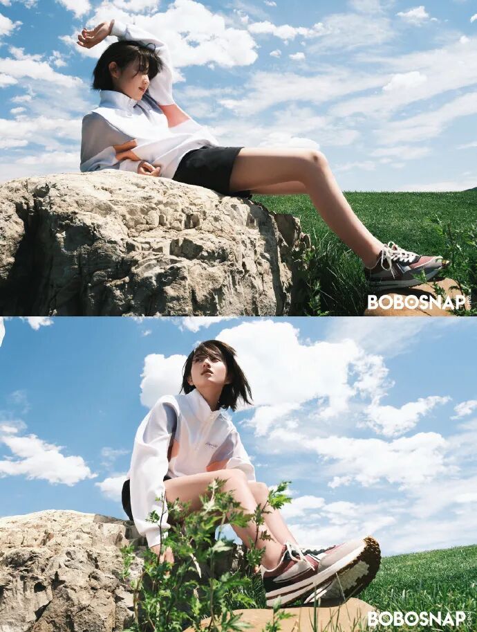 最后一套两人都身穿特步新品系列,子枫穿着特步活力系列复古卫衣外套,蓝天白云下短发的白色运动服很有少年感;娜比穿着特步街头系列背带裤走街头辣妹风,虽然两人穿搭风格各不相同但脚上都是特步复古系列溯影老爹鞋。