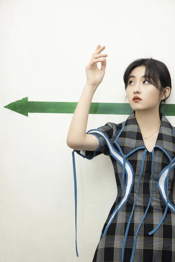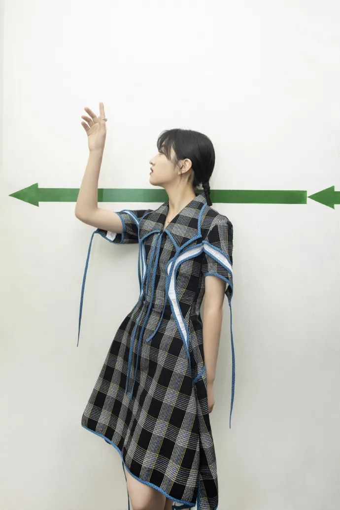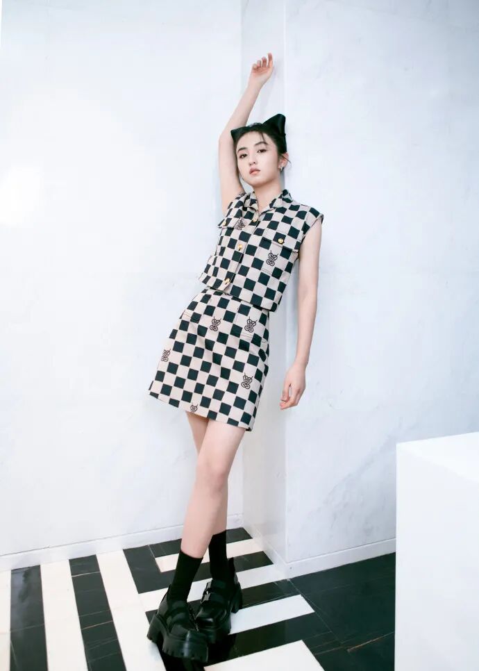 子枫妹妹很少穿着这种非常修身的衣服,这套格纹套装来自设计师品牌 Giambattista Valli 2021 春夏款,搭配 lost in echo 玛丽珍和猫耳编发,可爱又灵动的猫系少女。