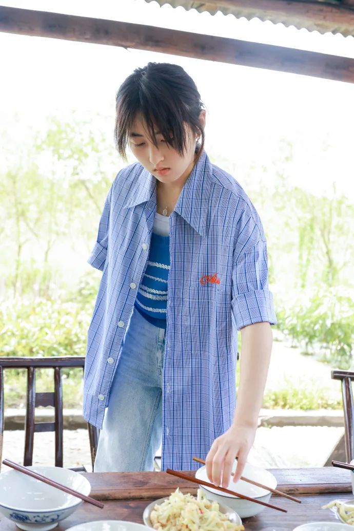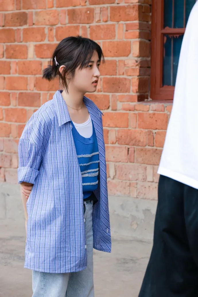 张子枫另一套在《向往的生活》中的穿搭,清爽的蓝色系穿搭很适合夏天,法国设计师品牌 Claudie Pierlot 毛衣背心内搭白 Tee,再叠穿 Ahhh 蓝色条纹衬衫,再搭配妹妹清爽的笑容让氛围都凉快了起来~