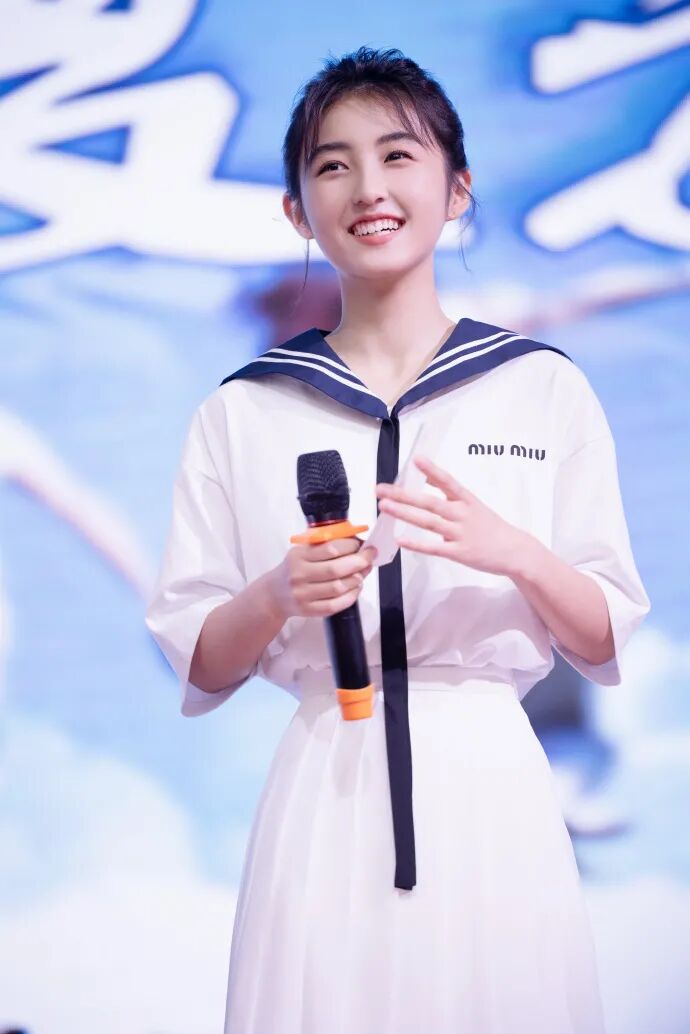 张子枫出席《盛夏未来》宣传活动的一身造型,身穿 Miu Miu Maritime 系列水手服,Miu Miu 的这系列海军领套装今年欧阳娜娜、周雨彤、张元英、虞书欣、杨超越等一众女明星都上身过,可以说是今年少女风穿搭单品的爆款。