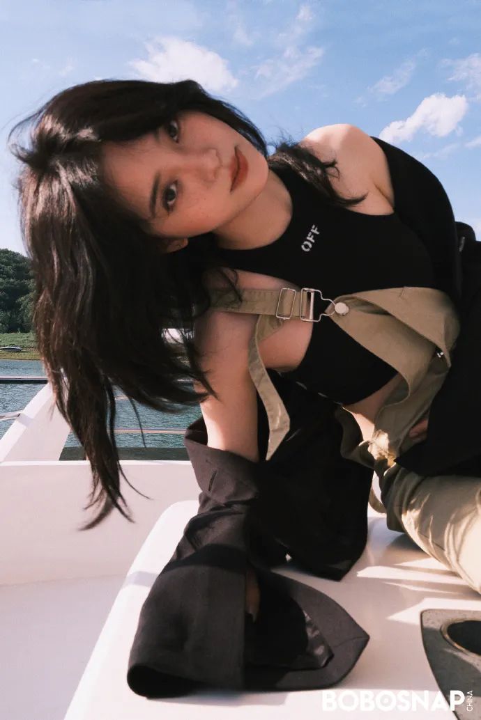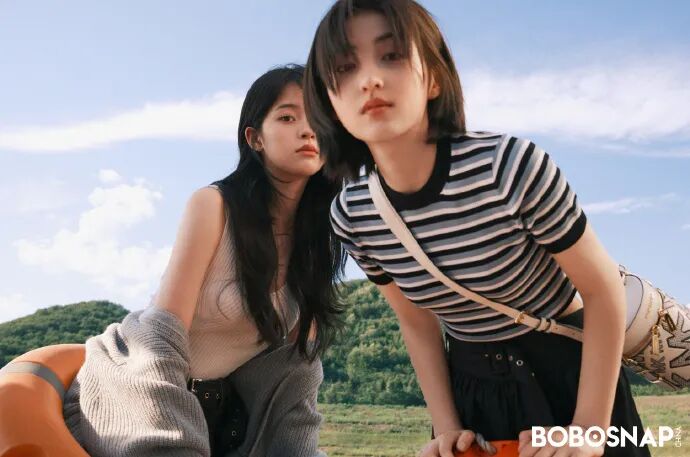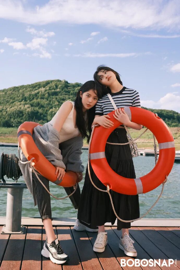 第一套是子枫妹妹和娜比的双人写真,两人戴着游泳圈在码头前拍照,互动也太甜了!张子枫身穿 Michael Kors 春夏系列,露脐条纹短 Tee 搭配黑色长裙,搭配七夕胶囊系列 BEDFORD 水桶包,温温柔柔的文艺少女 Feel。