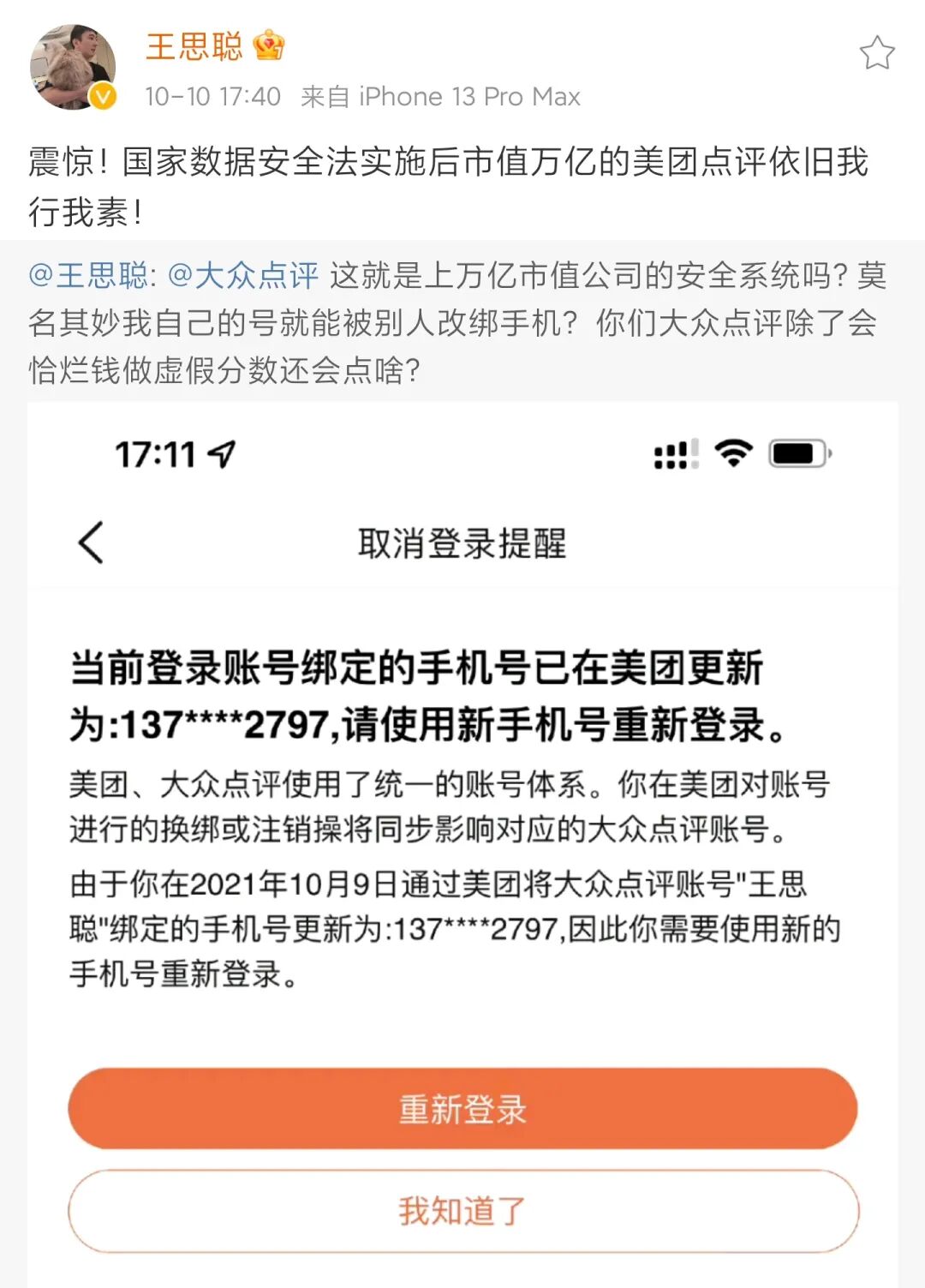 据王思聪所说,他的大众点评账号在没有经过任何本人验证的情况下,就被他人在美团上改绑为其它手机号。