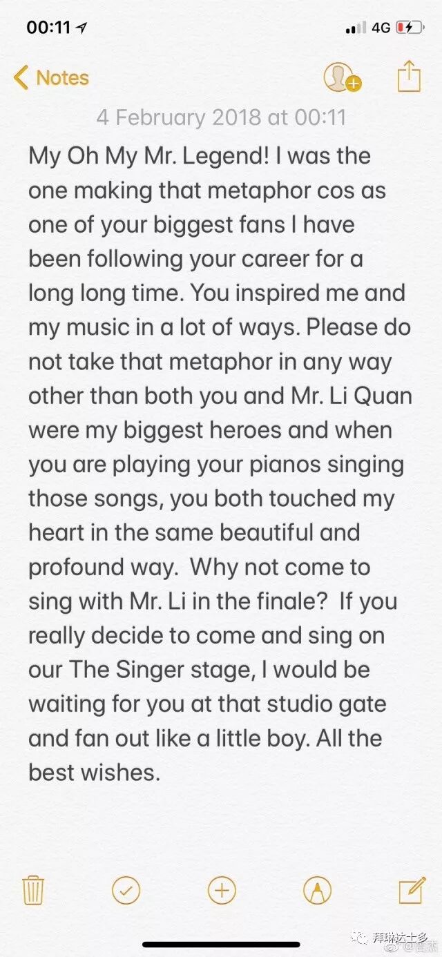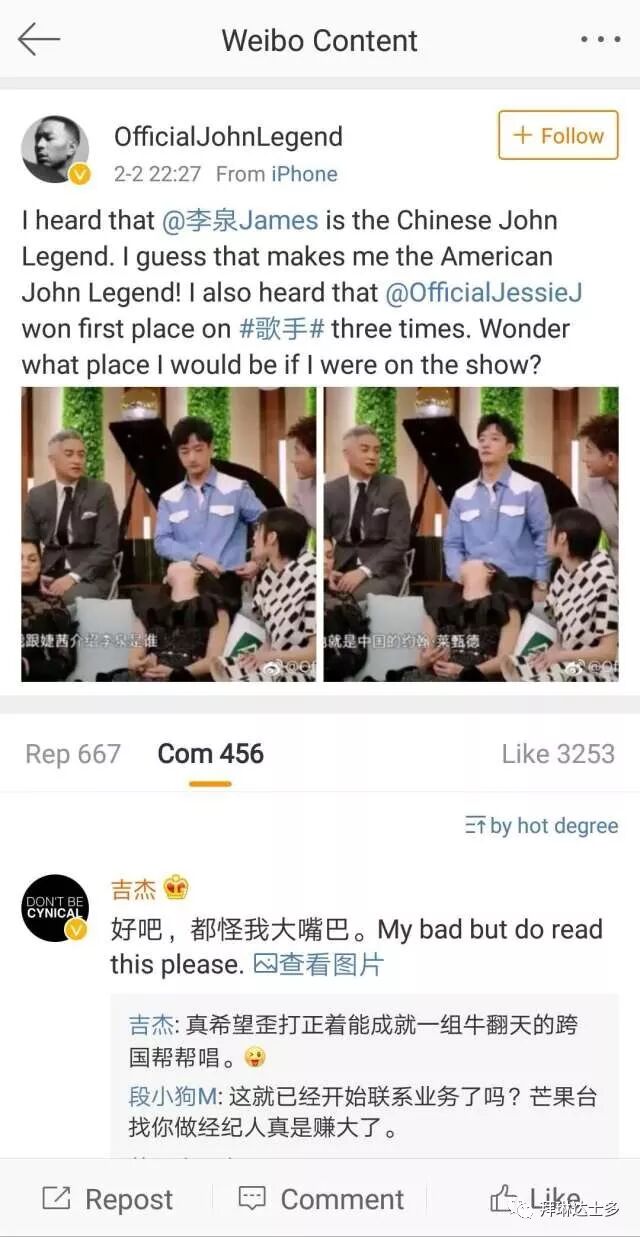 吉杰就微博评论李泉和传奇哥到时候可以一起同台,期待他真的出现在歌手的舞台