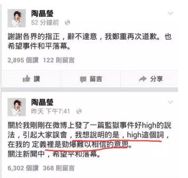 当年台湾有一起劫持事件,结果她评价这件事用了high,被骂后又道歉了,说自己对high的理解有误。