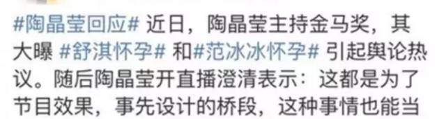 不仅拿莫须有的怀孕来炒噱头,她还疑似讽刺范冰冰为“毯星”,在范冰冰上台时,陶晶莹说她:“走得一腿好红毯,上得一众颁奖台”。