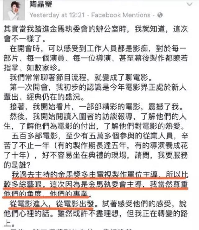 后来她发了声明,表示这一届金马奖很不一样,所有参与的人都是从电影出发,而自己因为主持综艺比较多正在转变当中。