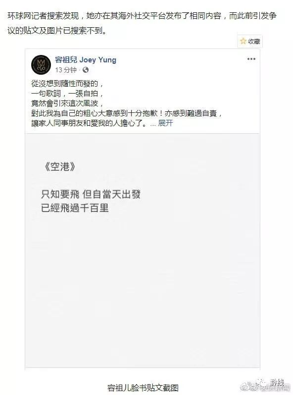 “从没想到随性而发的一句歌词,一张自拍,竟然会引来这次风波,对此我为自己的粗心大意感到十分抱歉!亦感到难过自责,让家人同事朋友和爱我的人担心了。