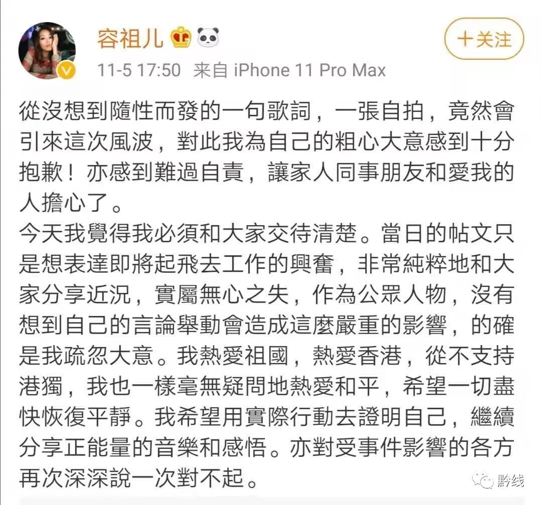 今天我觉得我必须和大家交待清楚。当日的帖文只是想表达即将起飞去工作的兴奋,非常纯粹地和大家分享近况,实属无心之失,作为公众人物,没有想到自己的言论举动会造成这么严重的影响,的确是我疏忽大意。我热爱祖国,热爱香港,从不支持港独,我也一样毫无疑问地热爱和平,希望一切尽快恢复平静。我希望用实际行动去证明自己,继续分享正能量的音乐和感悟。亦对受事件影响的各方再次深深说一次对不起。”