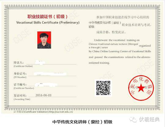 线下学习考试阶段沿袭古制,采取师承推荐的方式,严格考评,严格界定。学员通过线下实操培训及考试,经考核合格后获得由中国职业技能在线学习中心发放的在线学习凭证号码,凭此号码登入中国职业技能在线学习平台进行线上学习并考试,线上考试合格后,平台最终进行审核并颁发经由中央电化教育馆备案通过的等级证书,证书防伪并在中央电教馆官方网站(http://ca.ncet.edu.cn/)查询。