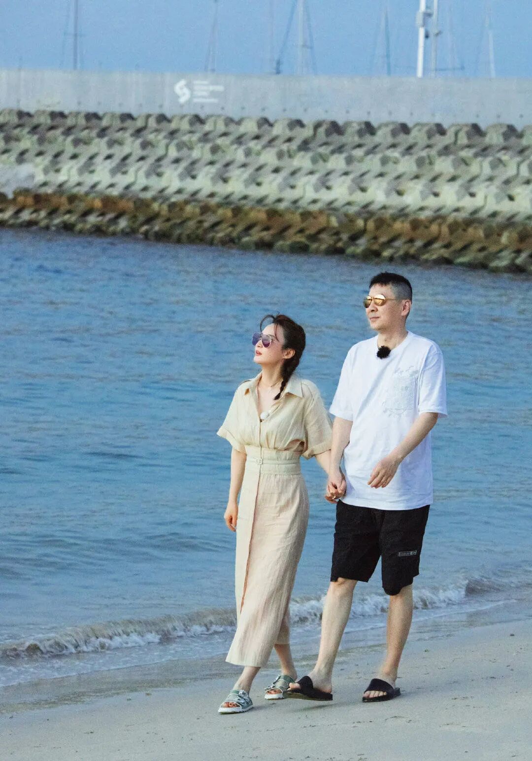 在这张照片中,蒋勤勤以一袭米色长裙优雅亮相,长裙的轻盈质地随风轻摆,映衬出她温婉动人的气质。她脚踏一双白色凉鞋,简约而不失时尚感,与长裙的色调相得益彰。浅色太阳镜不仅为整体造型增添了几分摩登气息,还巧妙地遮挡了刺眼的阳光。