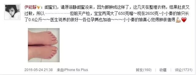 5月24日晚,伊能静通过微博曝产期将至脚肿严重的照片,并称:“闺蜜们,请原谅静闺蜜没来,因为脚肿成这样了,这几天在整理衣物,结果肚皮又过敏,所以……但前天产检,宝宝两周大了650克喔!现在2650克,小小秦的娘只长了0.6公斤,医生说养的很好!各位孕妈也加油!小小秦的娘真心觉得肿很值得。”