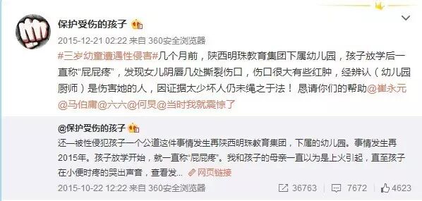 说的是西安一名三岁女童疑遭性侵的事情。网民“保护受伤的孩子”发微博称,自己三岁女儿去年在西安一幼儿园遭遇性侵害,但因证据太少,半年一直未能处理。目前,已有章子怡、汪峰、姚晨等多位知名艺人转发微博声援,表示强烈谴责变态行径。