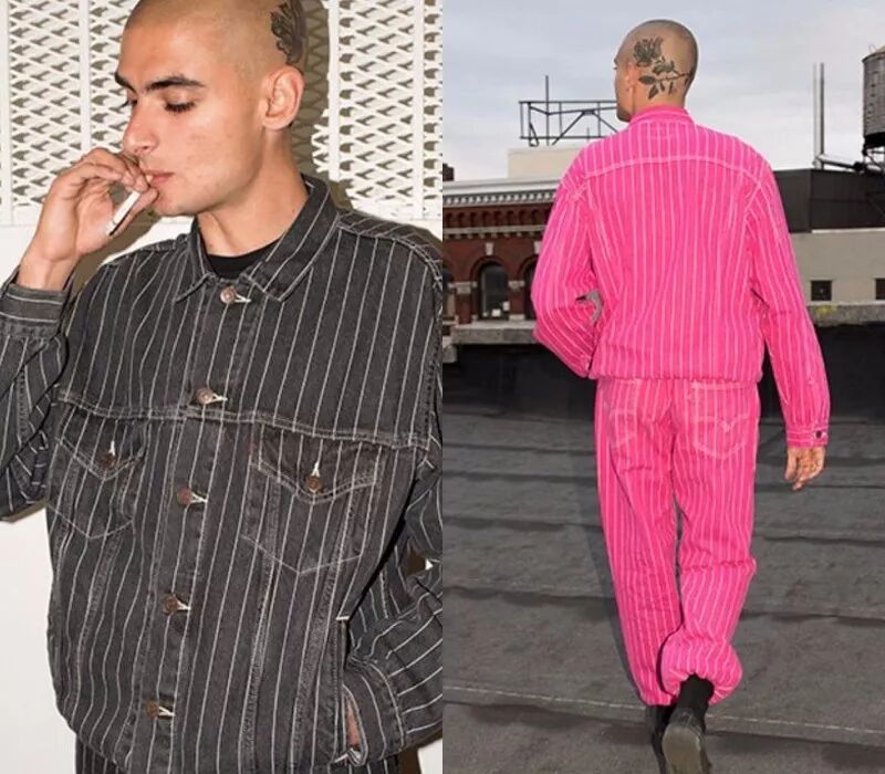 最近Supreme又出新的联名款啦!它与美国知名牛仔老牌Levi’s合作推出了条纹 “石洗”夹克和牛仔裤: