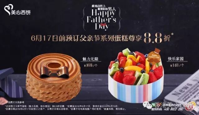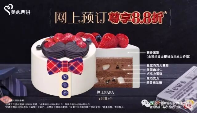 美心父亲节系列蛋糕,现已接受预定,6月17日前预定享受8.8折!快来太阳新天地B1的美心西饼看看吧~