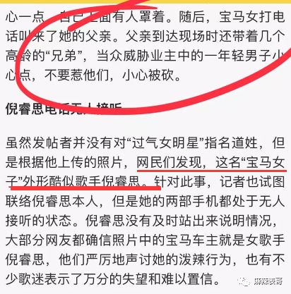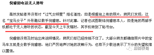 当时网友根据上传的照片,发现这个宝马女外形酷似倪睿思。之后记者联系她,两部手机都是无人接听的状态。
