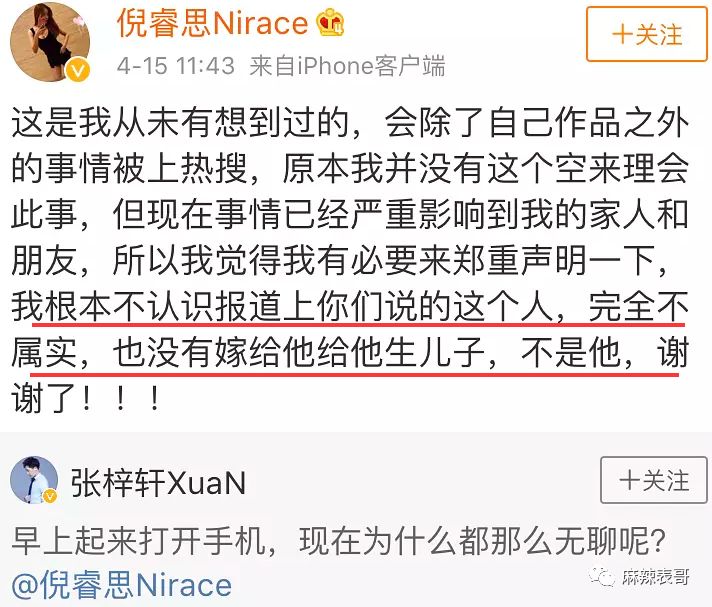 今天倪睿思上热搜以后,她就出来澄清,说自己根本不认识叶某,也没有嫁给他给他生儿子。