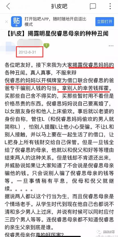 2012年的时候,就有人在贴吧上爆料有关她的母亲的一些事,说是联合她爸爸一起骗钱,类似于高级的仙人跳。