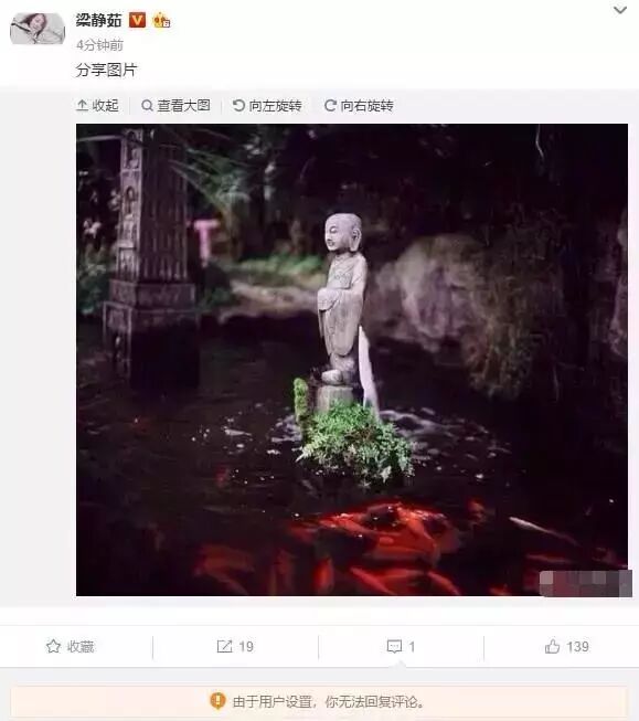 随后梁静茹的动态就是更新了一张佛像的照片,疑似在暗示自己佛系,退出这场闹剧斗争,并且把网友和粉丝都屏蔽不准回复了。