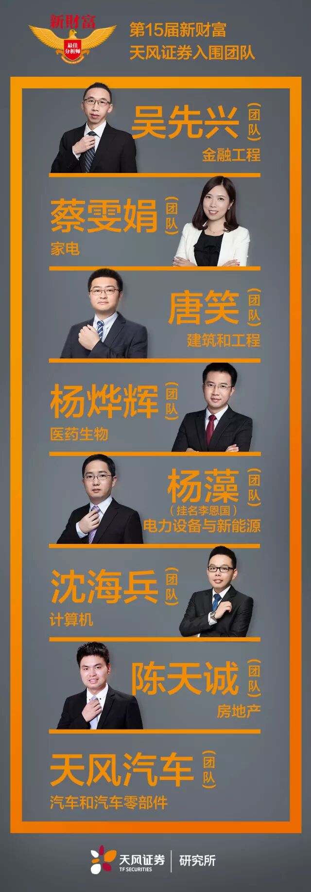 荣誉意味着更多责任,未来一年,天风研究团队将展现更多“科学化”的变化,更“数据化”的精神,更符合“实时势”标准的努力,更好的投研服务。