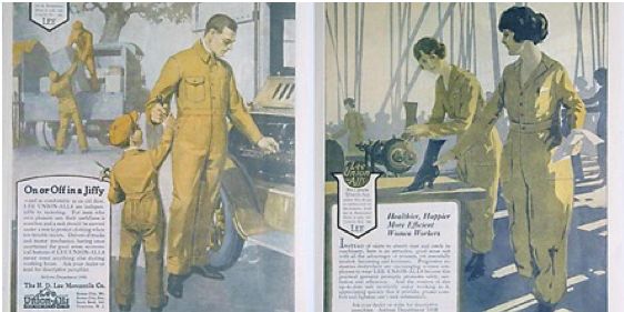 1913,世界第一条Union-All连体工作服诞生,当时广告画面上俨然已经出现女性工人的身影。