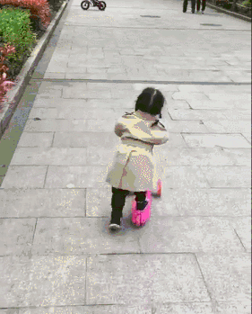 同样的发型、同样的外套、同样的粉红小滑板……唯一不同的就是,现在的小花不但溜得特稳,还学会单腿溜了!
