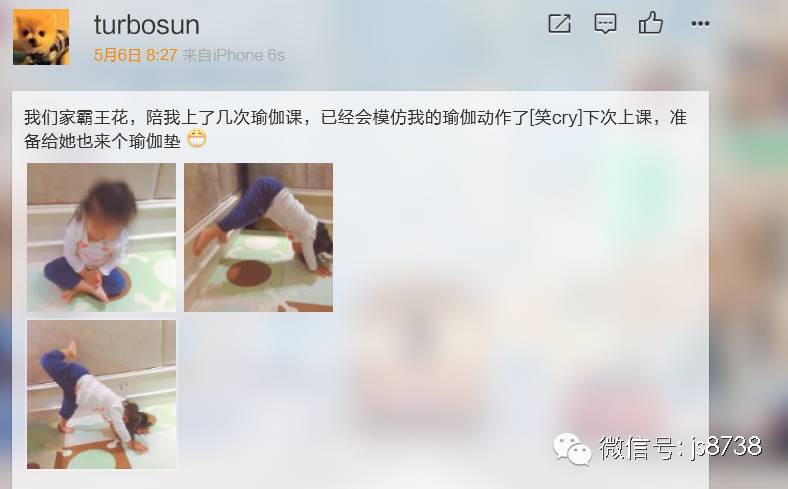 今天,孙俪在微博上晒出了一组女儿霸王花模仿妈妈练瑜伽的照片,并表示“我们家霸王花,陪我上了几次瑜伽课,已经会模仿我的瑜伽动作了!下次上课,准备给她也来个瑜伽垫~”