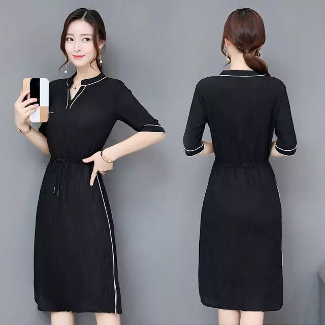短袖时尚条纹V领韩版中长款2017年春季连衣裙