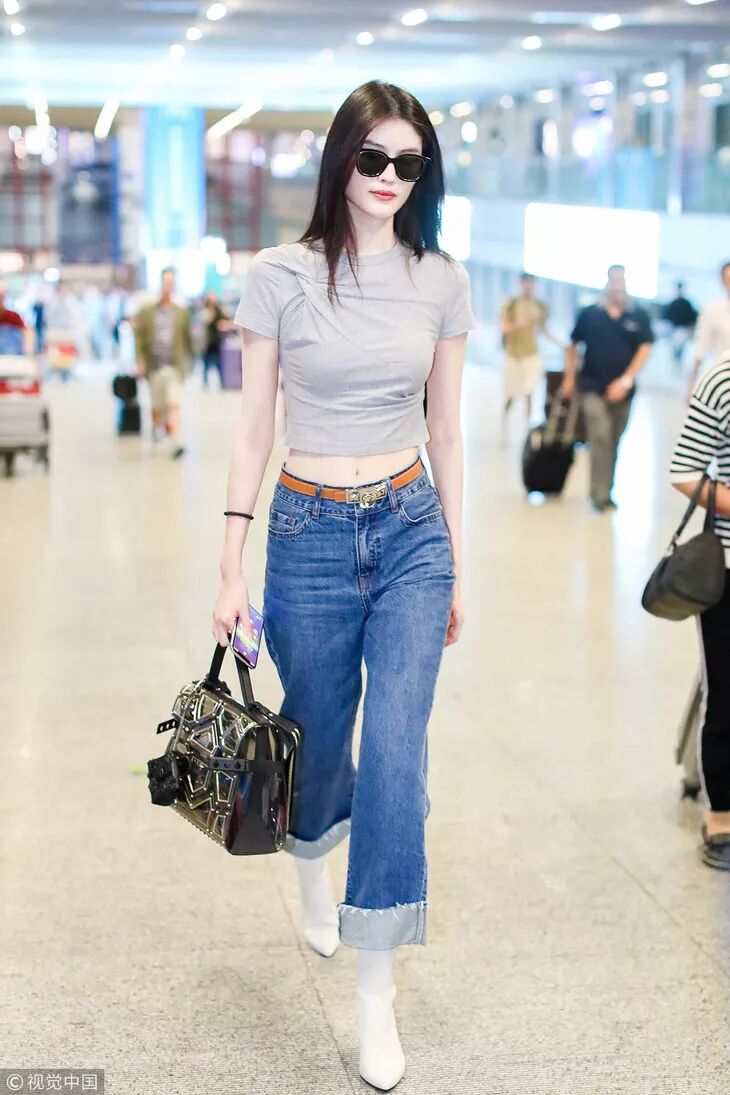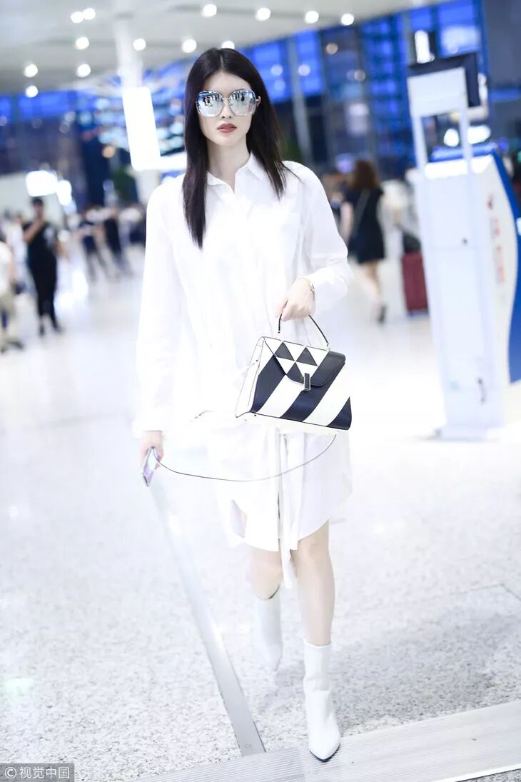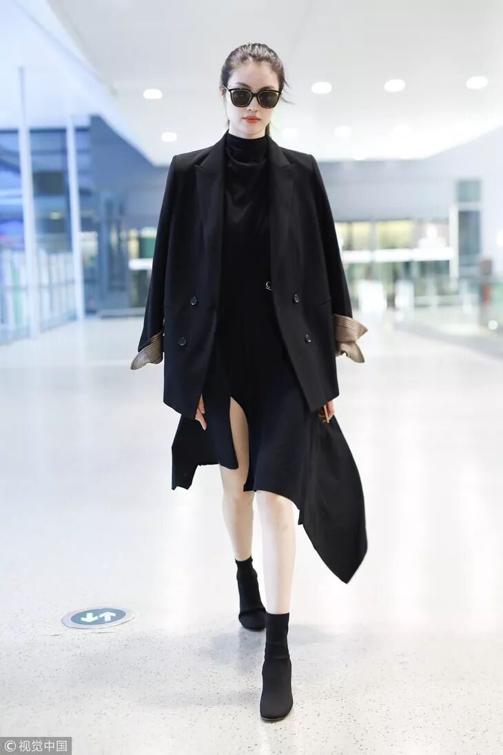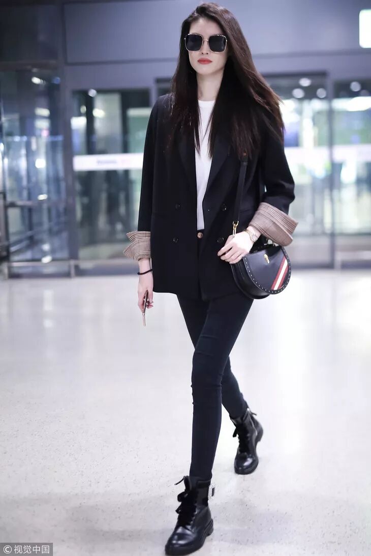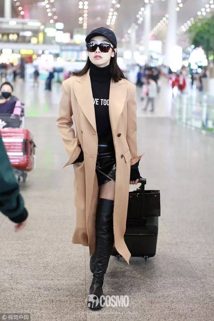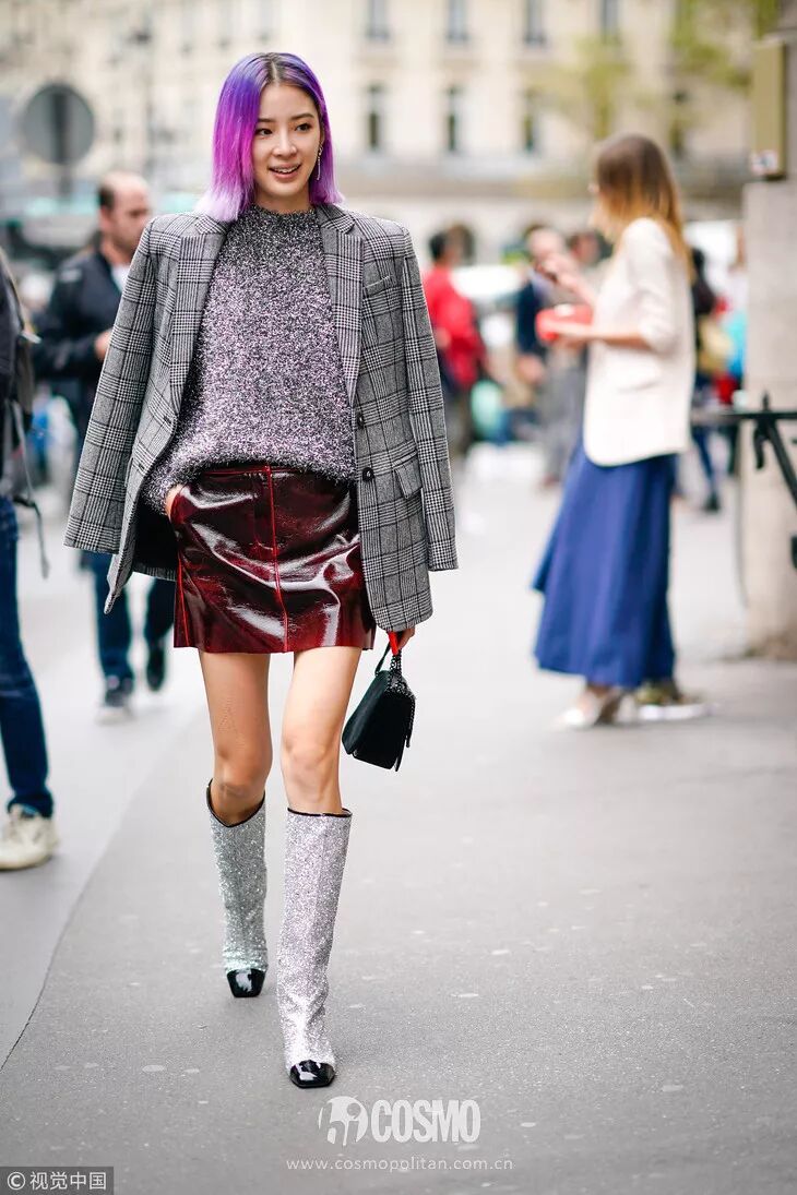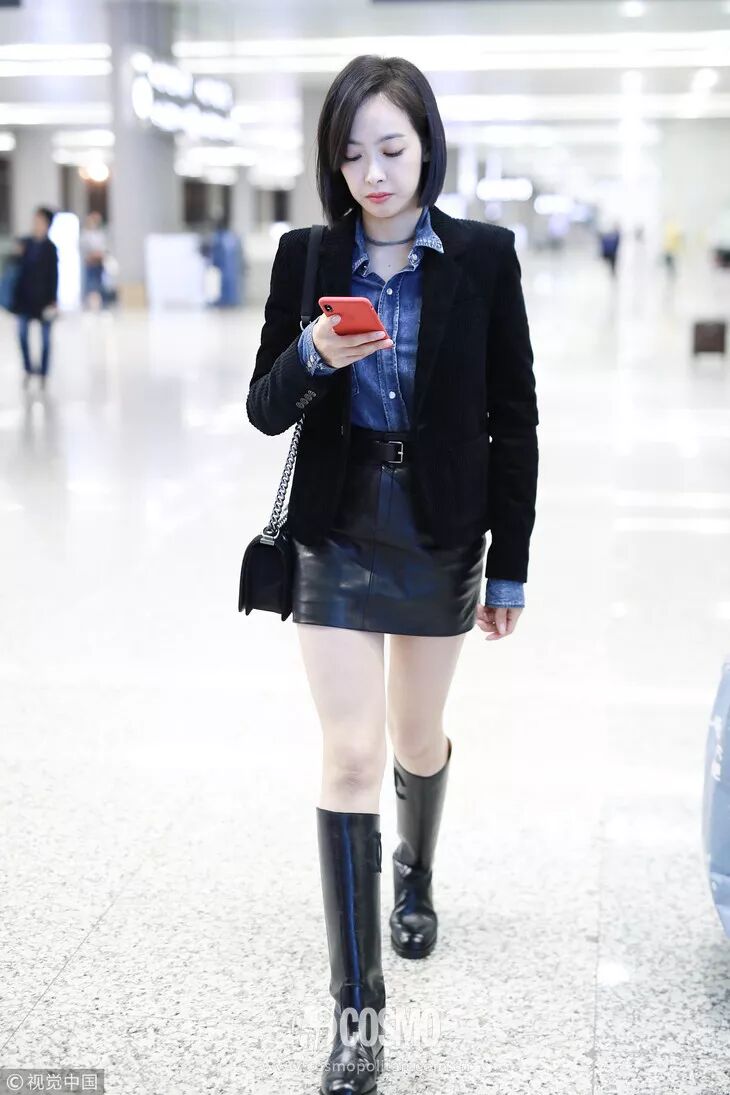 像宋茜穿的这种长度在膝盖以下的硬质皮靴,个子高矮都可以穿。主要不要选择太过花哨的颜色图案,简约才美。茜妞用西装外套搭配皮质短裙,脚下穿高筒皮靴,混搭风酷帅有魅力,气场upup,也是非常会穿了。