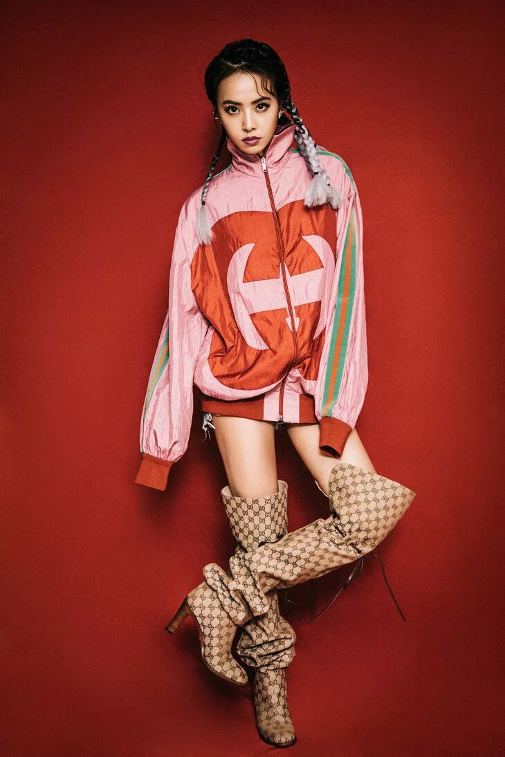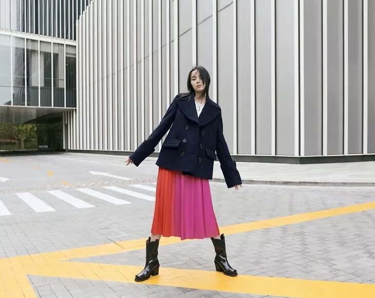 雎晓雯为H&M拍摄时尚大片时,上身穿深色双排扣外套,下身着彩色百褶半裙。脚上穿黑色亮皮牛仔靴,俏皮又可爱。