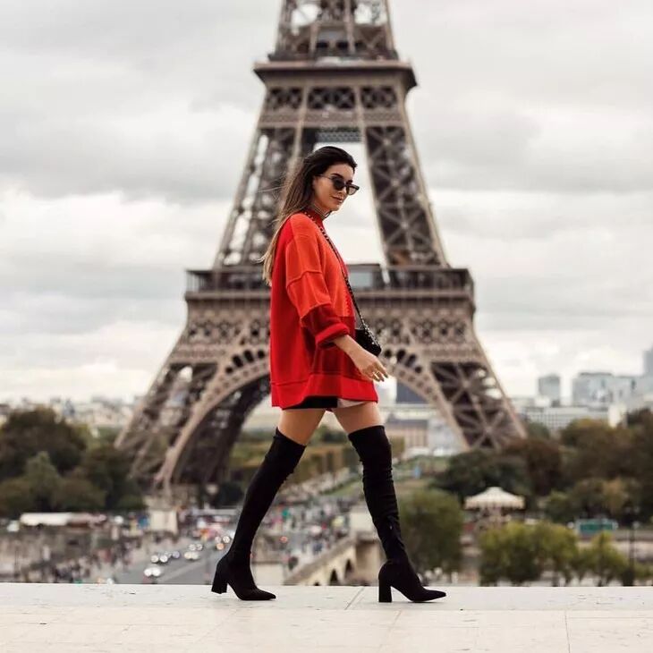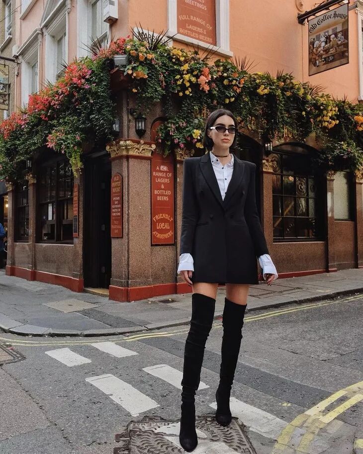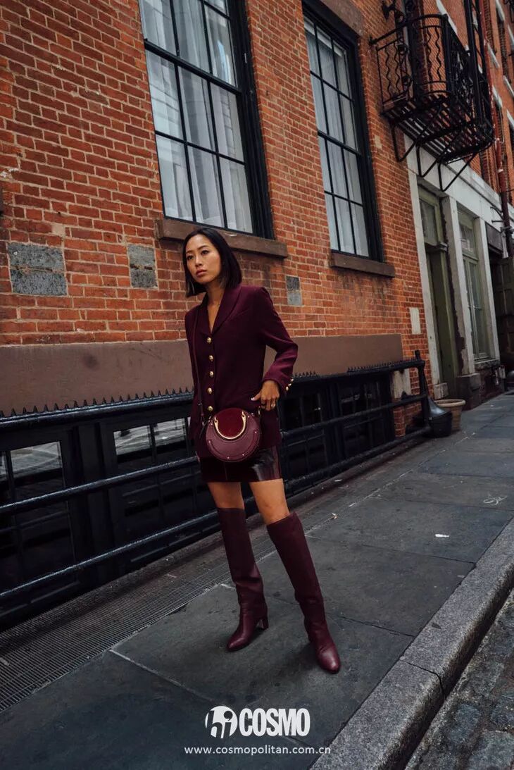 顺色搭配:选择和靴子一样颜色的衣服,搭配起来整体高级又简单统一。
