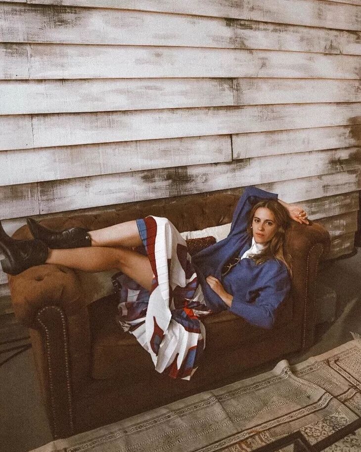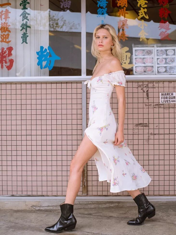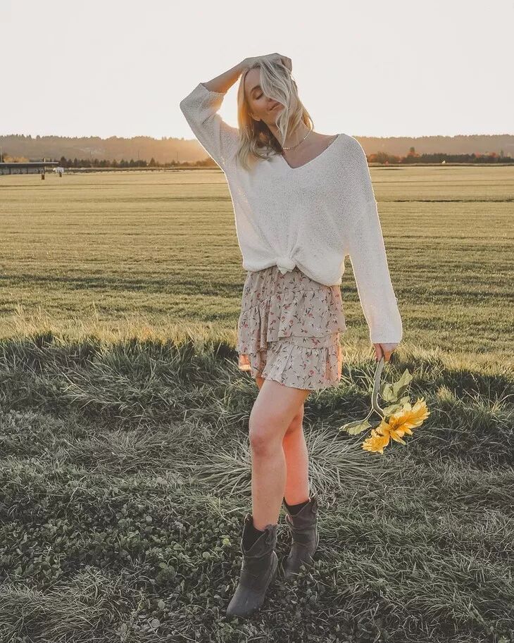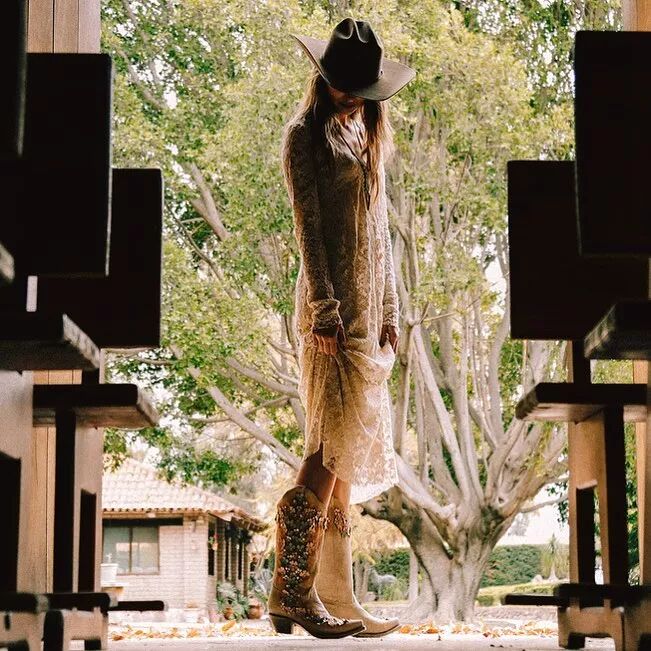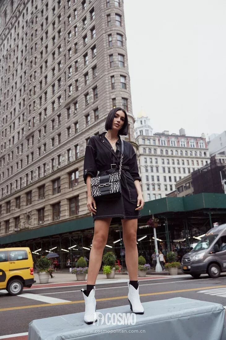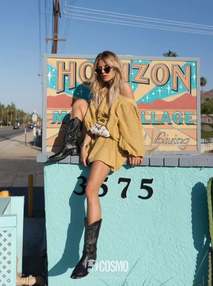 更多的女孩子喜欢用裙装搭配牛仔靴,裙子本身的温柔淑女感中和了牛仔靴的硬朗帅气,达到一个完美的平衡。