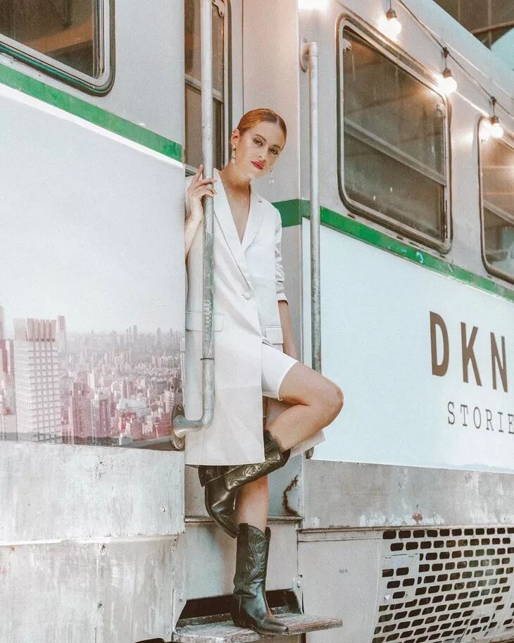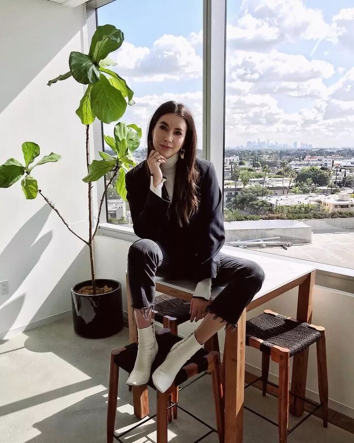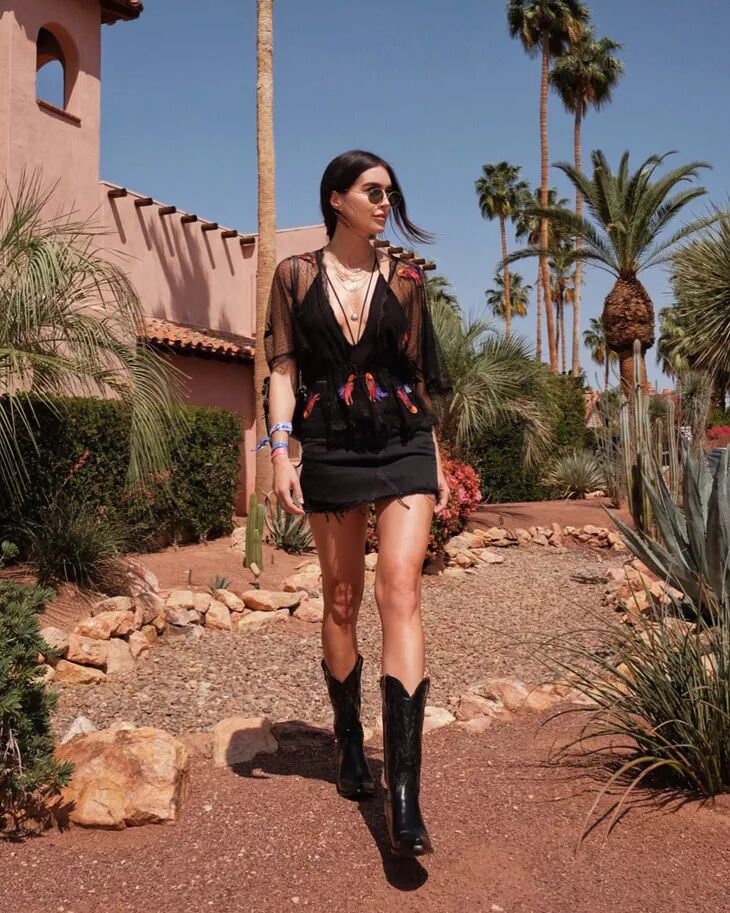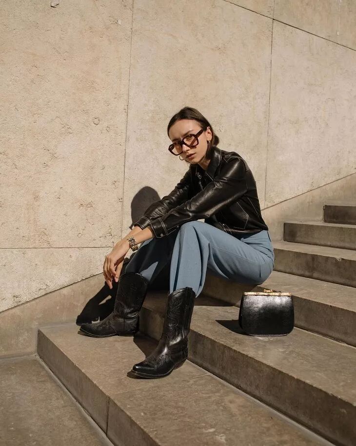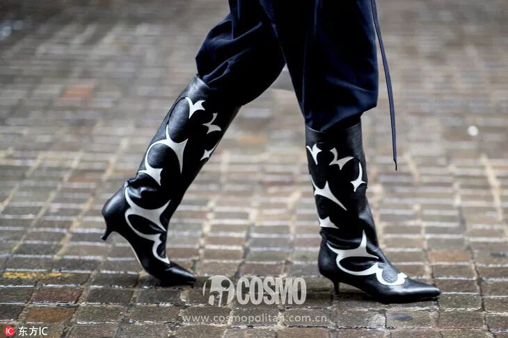 牛仔靴中包含的西部牛仔风情和自由奔放吸引了一众时髦精。在穿搭上,搭配裤装和裙装都可以。如果说把西部牛仔风还原的最透彻的,就是这种把宽松的裤腿塞进靴筒的装扮了。
