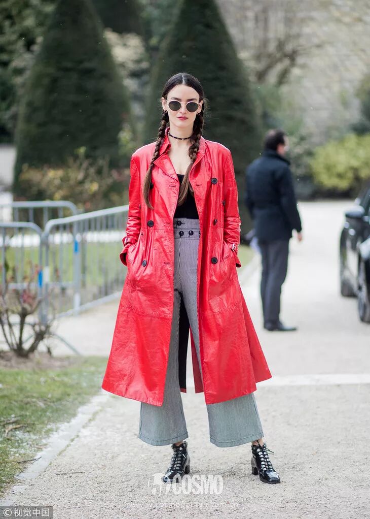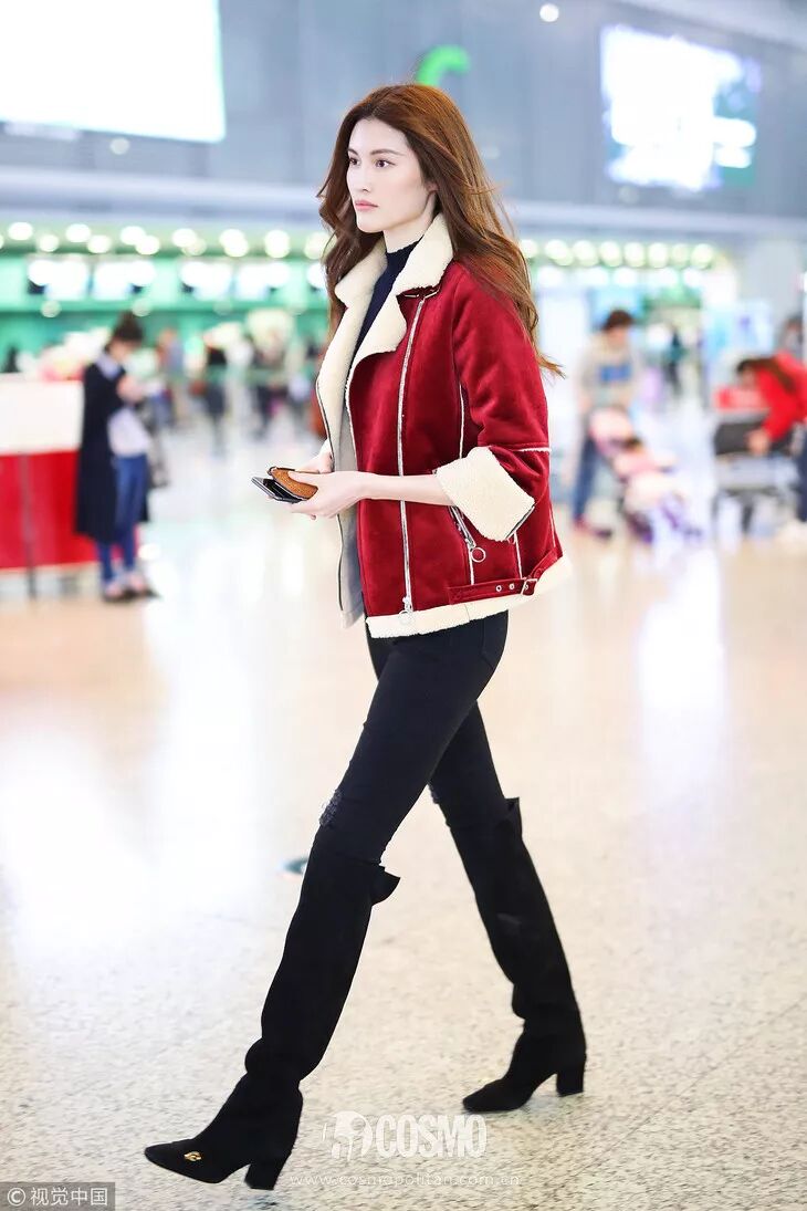 冬天又怎么少的了长靴呢!何穗身着红色羊羔毛夹克,搭黑色裤子和高筒方头黑色靴子,真的腿长两米了。何仙姑这套LOOK,COCO疯狂爆灯~
