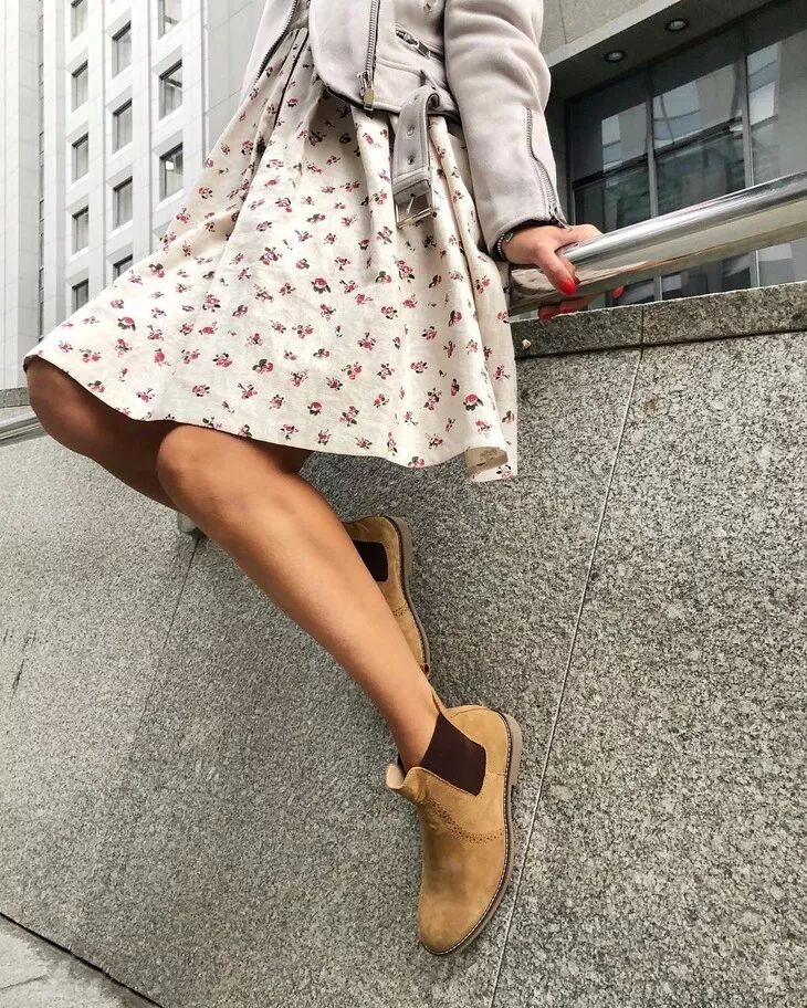 一年四季都喜欢穿裙子的仙女们也可以用裙装搭配切尔西靴,优雅又帅气。