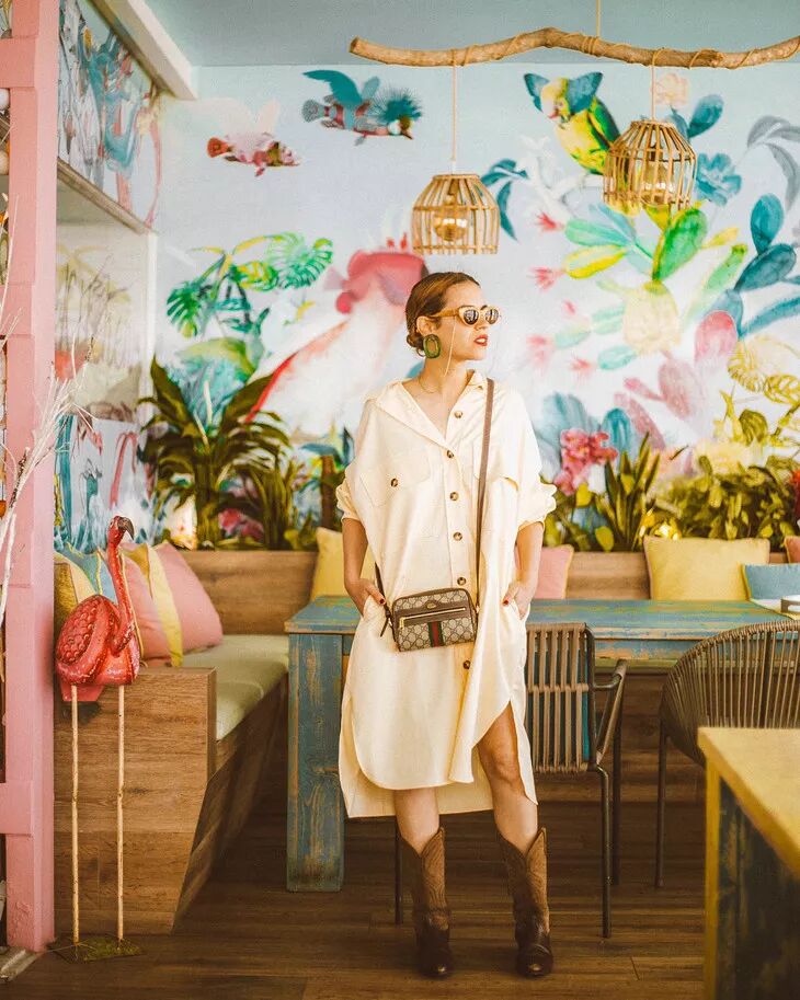 穿长款衬衫中间系腰带转换成裙装,本身就酷帅个性,加上牛仔靴,时髦感升级。