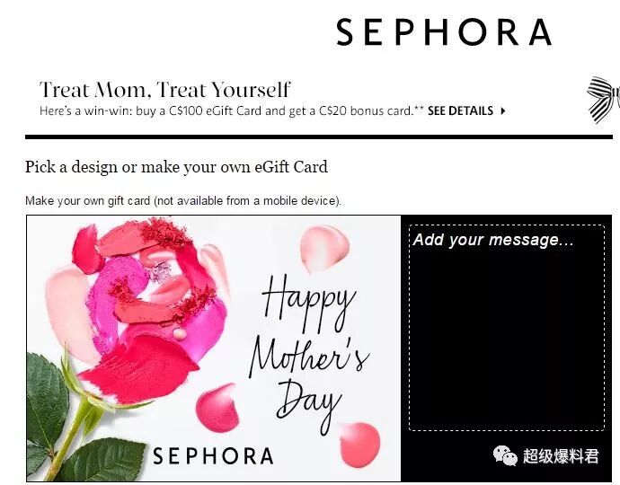 sephora.ca 现在有母亲节电子礼品卡满额赠的大优惠!买$100赠$20。相当于八折!