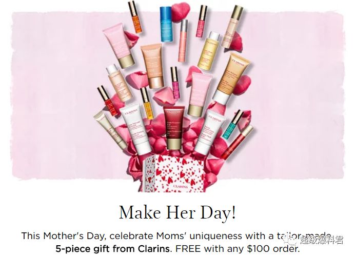 Clarins 娇韵诗官网现有购物满$100送母亲节5件套大礼包(价值$115)的活动,满$100免运费,额外送5件小样!