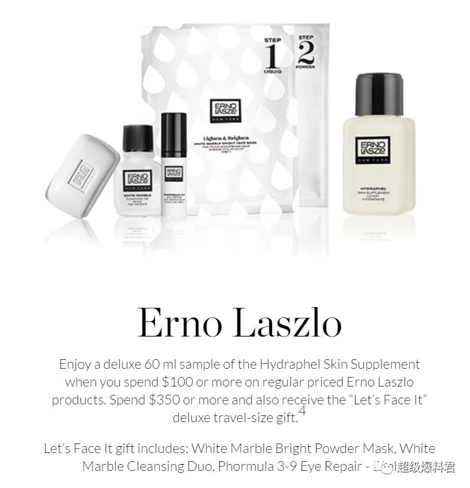 Erno Laszlo:只要税前购满$100,即送60ml 滋润保湿护肤水。买满$350,额外赠送3件套。