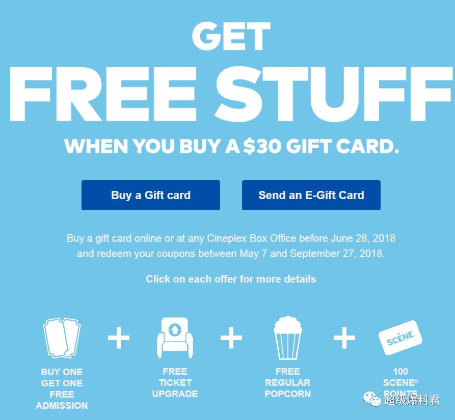 爱看电影的朋友们别错过这个Deal!即日起到6月28日,只须购买$30 Cineplex电影院消费卡,即送一个价值超过$30的礼物包,礼物包内有以下优惠:
